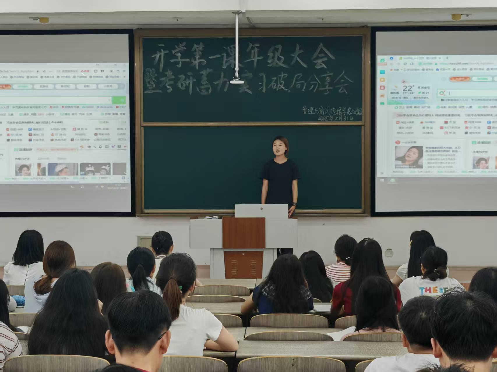 8月31日晚,管理与新闻传播学院2023级在教学楼311教室召开考研、实习分享会。会议特邀学院2023届毕业生、现华南师范大学研究生王羽竹分享经验,2023级全体学生、助理辅导员乔欣悦参会,会议由辅导员王宏主持。